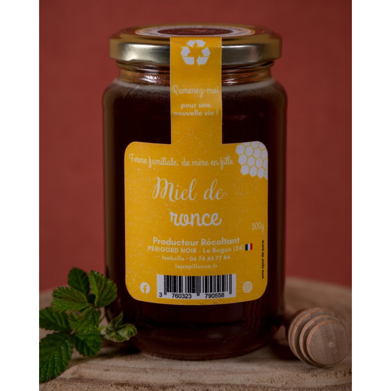 Le miel de ronce, monofloral, provient des fleurs de ronce. Sa couleur varie du jaune doré au brun clair, et sa texture est fluide mais peut devenir crémeuse en cristallisant. Il offre un goût doux avec une légère note fruitée et une subtile acidité, accompagné d'arômes floraux et herbacés. Riche en antioxydants, il possède des propriétés antibactériennes et apaisantes, souvent utilisé pour soulager les maux de gorge et renforcer l’immunité. En cuisine, il est polyvalent, parfait pour sucrer tisanes, desserts ou vinaigrettes, et délicieux en tartinade.